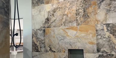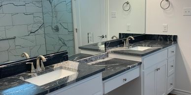 The bathroom features custom granite countertops, custom fixtures and large custom shower.